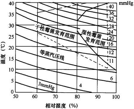 6.2.7、6.2.8 本節對圍護結構內表面抗菌涂飾工程進(jìn)行了規定,由于在食品工業(yè)用房?jì)仁褂每咕匡椆こ棠壳霸趪鴥韧庖庖?jiàn)不太統一,擔心抗菌產(chǎn)品會(huì )使食品中產(chǎn)生抗藥性菌株,但對于濕度經(jīng)常超過(guò)75%或有蒸汽作業(yè)的房間或關(guān)鍵區域的抗菌防霉問(wèn)題,目前仍沒(méi)有更好的解決辦法,內表面抗菌有很多方法,如消毒,但本規范僅對使用抗菌涂料的情況進(jìn)行了規定。當相對濕度達到80%時(shí),不論溫度高低,基本上都要發(fā)霉,見(jiàn)圖4,所以此時(shí)可涂防霉涂料。