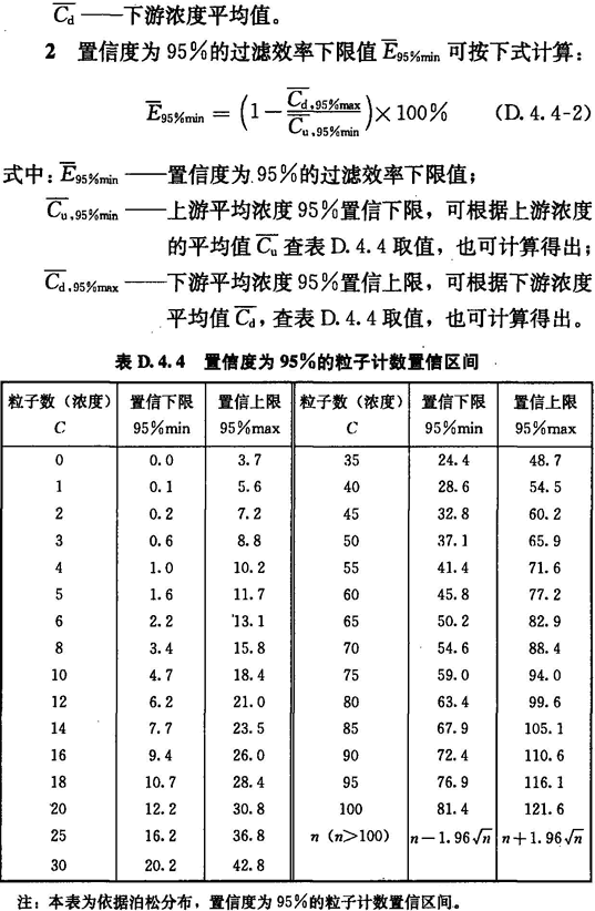 2 應根據上游95%置信下限的粒子濃度Cu,95%min和過(guò)濾器最大允許透過(guò)率(0.01%),計算下游允許最大濃度,再根據表D.4.4查得或計算下游允許最大濃度的95%置信下限濃度Cd,95%min。