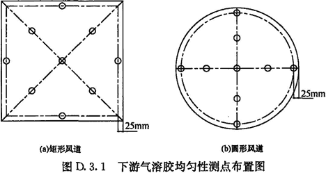 2 可在過(guò)濾器下游(或混勻裝置下游)適當距離處,選擇一斷面,在該斷面上至少布置9個(gè)采樣管,采樣管為開(kāi)口迎向氣流流動(dòng)方向的剛性金屬管,管徑應盡量符合常規采樣儀器的等動(dòng)力采樣要求,其中5個(gè)采樣管在中心和對角線(xiàn)上均勻布置,4個(gè)采樣管分別布置于矩形風(fēng)道各邊中心、距風(fēng)道壁面25mm處(圖D.3.1a)。圓形風(fēng)道采樣管布置采用類(lèi)似原則進(jìn)行(圖D.3.1b)。應在氣溶膠發(fā)生器穩定工作后(此時(shí)被測過(guò)濾器上游氣溶膠濃度至少應為進(jìn)行效率測試試驗時(shí)下限濃度的2倍以上),對每個(gè)測點(diǎn)依次進(jìn)行至少連續3次采樣,每次采樣時(shí)間不應少于1min,并取其平均值作為該點(diǎn)的氣溶膠濃度檢測結果。當所有9個(gè)測點(diǎn)的氣溶膠濃度測試結果與各測點(diǎn)測試結果算術(shù)平均值偏差均小于±20%時(shí),可認為過(guò)濾器下游氣溶膠濃度均勻性滿(mǎn)足測試需要。