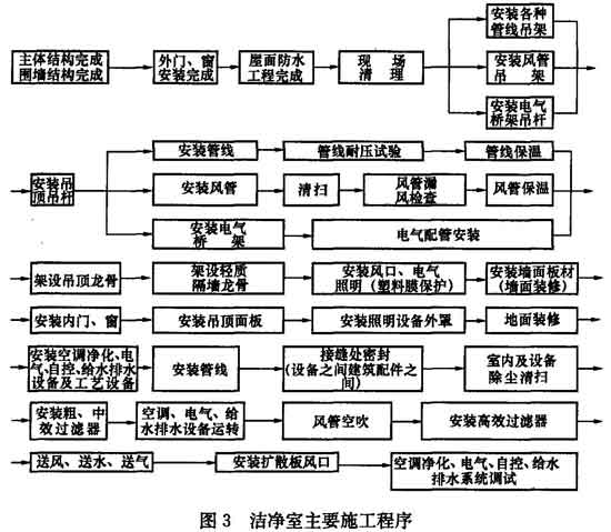 9.1.1 三級和四級生物安全實(shí)驗室是有負壓要求的潔凈室,除了在結構上要比一般潔凈室更堅固、更嚴密外,在施工方面,其他要求與空調凈化工程是基本一致的,為達到安全防護的要求,施工時(shí)一定要嚴格按照潔凈室施工程序進(jìn)行,潔凈室主要施工程序參考圖3。