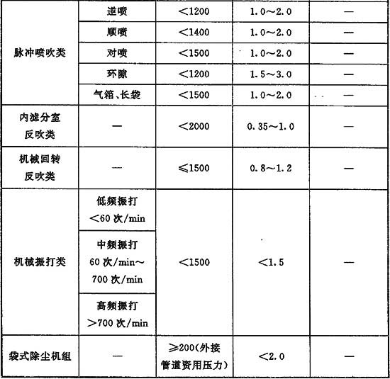 表3 各類(lèi)布袋除塵器過(guò)濾風(fēng)速和壓力損失