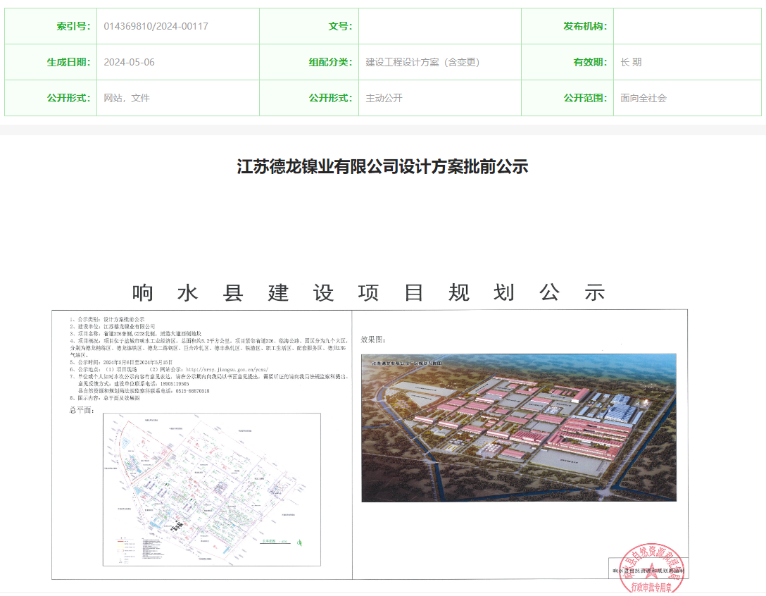 5月6日,江蘇德龍鎳業(yè)有限公司設計方案批前公示,公示時(shí)間:5月6日-5月15日。