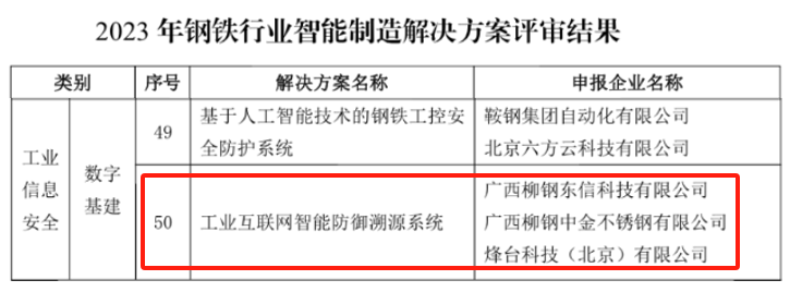 近期,在中國鋼鐵工業(yè)協(xié)會(huì )、鋼鐵行業(yè)智能制造聯(lián)盟共同開(kāi)展的 “2023年鋼鐵行業(yè)智能制造解決方案及典型場(chǎng)景應用案例遂選”活動(dòng)中,柳鋼東信公司“工業(yè)互聯(lián)網(wǎng)智能防御溯源”攻關(guān)方案入選2023年鋼鐵行業(yè)智能制造解決方案名冊。